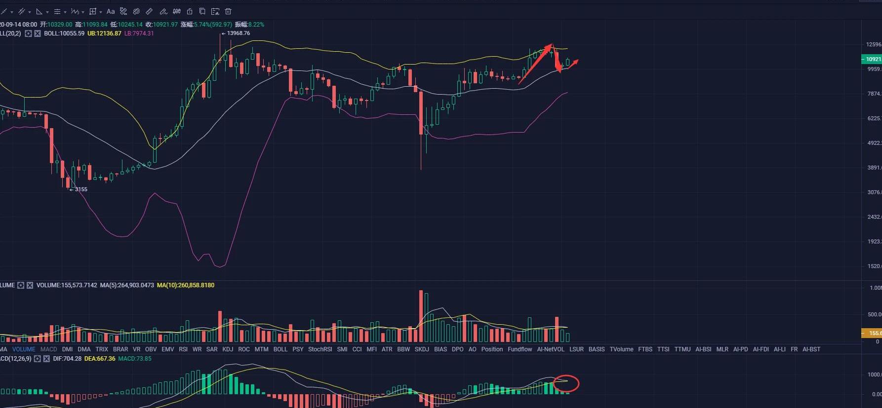 隨著Uni的火爆,當前DeFi也宣告著進入下半場,而DeFi項目玩的方式或許也發生了改變。就像當初Balancer的流動性挖礦火了以后被爭相模仿一樣,當前市場也在討論Uniswap空投的方式其他項目是否會仿制。對其他項目來說,這是個很現實的問題,當前除了跟隨Uniswap的腳步,自己開發新的亮點耗時間耗精力,還不一定能和Uniswap爭奪熱點,更關鍵的是,當前的市場風向就是如此,若是項目方發了一個項目后,投資者和礦工的第一反應就是能不能挖礦,能不能薅羊毛,否則基本上是泯人眾人矣。當前市場的整體結構就決定了投機大于投資,真正的金礦也會被加速煉化,DeFi市場都在干殺雞取卵的事。很明顯的便是當前中心化交易所的節奏,前段時間DeFi火爆后中場休息的時候,各大中心化交易所紛紛按捺不住,開發了公鏈,上線DeFi項目,但熱度沒有持續兩天就被Uniswap打壓下去了,其實也不算是被Uniswap打壓的,在Uni上線前,某些交易所的DeFi項目就被打上了不好印象的標簽。但是交易所聰明的地方就在于,當其他項目確實很出色的時候,他不會去強行搶風頭,而是先蹭著熱度,如Uni發幣后,眾多交易所第一時間上架了Uni,也發布了圍繞Uni的公告,展現了蹭熱度的最佳方式。而現在,Uniswap又展現了新的創新方式,就是給交易所抄作業的機會,但交易所像這樣做的話,需要衡量的方面勢必會多一點。也可以直接像Uniswap這樣,直接發幣,而這個要看交易所本身的實力,他們直接發平臺幣的話,可能會引起拋售潮,而且按照Uni的做法只發給老客戶,那無法達到吸引新客戶的效果。唯有在DeFi上做文章,參與DeFi發幣之類的,或者再制定不同的標準甚至鎖倉期,讓老客戶滿意的同時,還能吸引新客戶進駐交易所。但這樣的時機很重要,現在發的話,DEX本身處于上升勢頭中,CEX再這樣做,或許會給投資者認為CEX都在抄DEX作業的感覺,如此還好,造成DEX趕超CEX已經勢不可擋的印象才是最麻煩的。當然以上的做法都具備不確定性,只是這樣做的概率比較大,畢竟CEX的客戶源還是很多的,還是有許多投資者僅在CEX上交易,整體還是交易所之間的競爭,就相當于平時生活中打車平臺玩補貼一樣,誰實力比較雄厚能耗死其他平臺,最后就能脫穎而出。還需要注意的一點是,交易所要讓投資者知道,這發的真的是真金白銀,否則只是一堆數據的話,那效果便沒有那么強。現在投資者的格局這么固定,新增投資者的速度又慢,各大交易所想要擴展業務只能到別的交易所搶客戶,這樣只能花費比較大的代價。而平時在做法上大家都差不多,該宕機宕機,該收割收割,所謂的功能和新幣種對投資者的吸引力并不大,只能看誰舍得多補貼一些,一旦能吸引來其他交易所的客戶,那對自己的實力都是比較好的補充,至于前期花費的代價,只要流量能過來,到后期還怕收割不回來么?對于我們投資者來說,這樣的情況是喜聞樂見的,只要坐在家里能收到免費發的幣,到誰家做不是做。當前Uni的風頭還是比較強勁,等過幾天稍微緩和些后,說不定Uniswap這樣的做法就會又掀起一場風潮。回到行情上,可以明顯看到行情周線碰到boll上軌后僵持不下難以繼續突破,隨后便回落至中軌,且考驗中軌支撐,本周沿著中軌的支撐開始反彈。