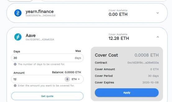 截圖源自:https://yearn.finance/zapCover保險服務在去中心化金融項目安全事件以及市場大行情轉變頻發的大背景下,DeFi保險服務應運而生,NexusMutual以及Opyn等等項目相繼冒頭。但不同于這些存在一定門檻的加密項目,YFI的保險產品無須KYC,只需要承保人和被保險者通過質押資產實現保險關系。