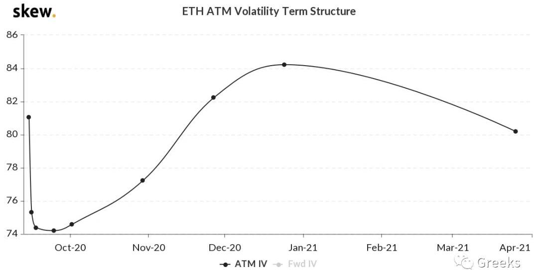 各標準化期限IV:今日:1m77%,3m84%,6m81%9/13:1m77%,3m91%,6m86%以太坊今日也是橫盤,中遠期IV加速下降。目前各期限的隱含波動率其實是比較接近的,這點與比特幣有所不同。