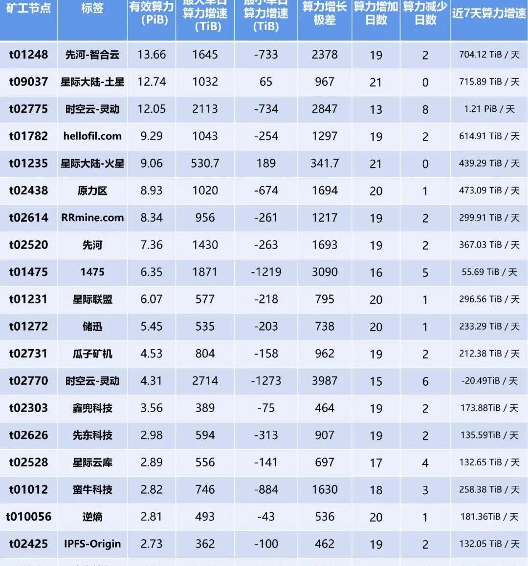 算力增速是衡量礦工封裝Filecoin能力的重要指標,封裝速度越快,礦工節點的算力增速也會越快。在第一屆SpaceRace當中,排名前20名的礦工節點里,來自時空云-靈動的節點t02770單日算力增速最高,為2714TiB。有意思的是,單日算力增速排名前兩位的節點均來自時空云-靈動。但與此同時,從“算力增長極差”這項數據來看時空云-靈動的節點算力增速波動性比較大。最近7天,礦工節點中算力增速最快的是來自時空云-靈動的節點t02775,增速達1163.89TiB/天。有效算力排名前六位的節點占據近7天算力增速前六位,因此近7天算力增速具有較高的參考價值。在算力增長天數的統計當中,星際大陸的兩個礦工節點“火星”和“土星”在全部21天當中都保持了算力增長,在前20名節點當中,只有這兩個節點保持全程正增長。在“算力增長極差”數據中,星際大陸的“火星”節點排名第一,算力波動最小。在20個礦工節點當中,算力減少天數小于或等于2天的節點數量為14個,占比達70%。這說明排名靠前的節點算力運行相對穩定,大部分節點處于“算力積累,穩中有進”的狀態。挖礦效率