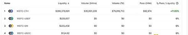 上圖:WBTC鎖定總價值Uniswap是目前加密行業里領先的去中心化交易所,其交易額一度曾超過Coinbase這樣的中心化交易所。現階段,Uniswap上的WBTC-ETH流動性池已經成為最“吸引”比特幣流動性的來源,因為它是Uniswap上的四個流動性之一,而且向其中注入流動性可以獲得UNI代幣獎勵。本文撰寫時,WBTC-ETH池已經是Uniswap上規模最大的流動性池,規模達到3.91億美元,自9月17日以來增長率達到驚人的900%。如下圖所示,我們可以看到Uniswap上其他WBTC流動性池的需求來源對比情況,除了WBTC-ETH流動性池在24小時內交易量創下近4000萬美元新高之外,其他池的流動性變化幾乎為零。