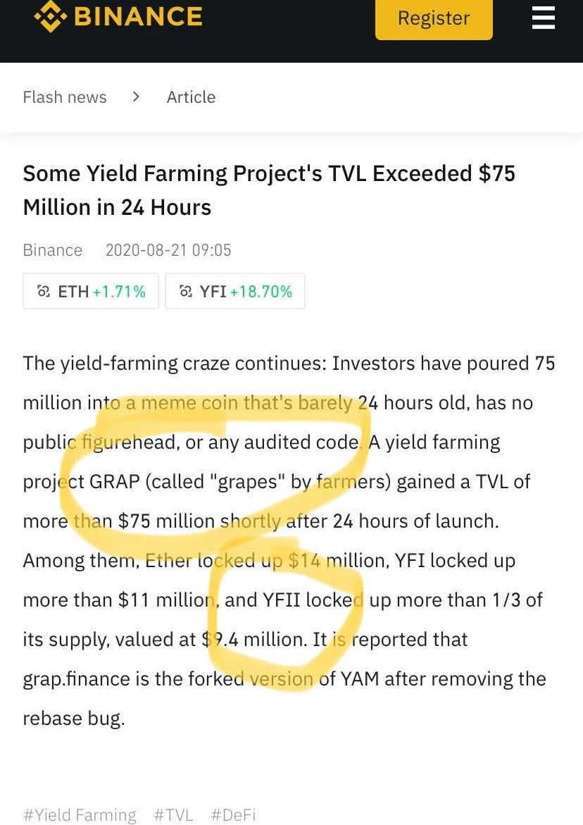 其實,周家寶對DeFi的投資故事如此抗拒是有原因的。從Compound推出流動性挖礦的時候,周家寶就在密切關注DeFi了。對了,忘了說,周家寶并沒有一份全職的工作,每天最大的樂趣就是投資或者投機。“我投機的成功率還是挺高的。”按周家寶的解釋,是因為他在入局一個項目之前,都要做到對項目全方位的了解。因此,周家寶觀望DeFi,觀望了整整兩個月。從COMP、AMPL到YFI、YFII、YAM,周家寶從來都是冷眼旁觀,并且積極地找人探討其中細節和原理。看到某些項目一飛沖天,周家寶內心毫無波動,甚至有一絲想笑。他一點都不羨慕,在他看來,只要研究透了,那么抓住接下來的機會,自己也能賺到想要的錢。當看到YFI瀑布,YAM崩盤時,他還有一點幸災樂禍。終于,經過兩個月的漫長學習,周家寶認為他懂了。恰逢CRV的上線,周家寶小試牛刀,投入了一點點錢去挖CRV,但最終的收入只是剛剛Cover了手續費,并沒有賺到什么錢。“不虧就是賺,我覺得我懂了。”YAM之后,一個仿盤Grap.finance上線。周家寶感覺機會來了。8月21日下午3點,周家寶攜帶10萬大洋進入了Grap的二池,以1.3美元的價格買了1萬多枚Grap。然后,就迎來了Grap的暴跌。“挖礦崩了,我完了,就幾天。”周家寶憤憤不平。“學習不夠。”這是周家寶對于這次投資失敗的總結。此外,在事后復盤投資步驟時,周家寶認為,最大的失誤在于對幣安的“報道”產生了誤判。8月21日上午9點,幣安Flashnews發布了一條新聞,Grap上線不到24小時,就鎖倉7500萬美元,其中以太坊鎖倉1400萬美元,YFI鎖倉11萬美元,而YFII鎖倉940萬美元。在Grap中,鎖倉量越高,意味著入金越多,幣價上漲的概率也就越高。“一開始我不覺得幣安的FlashNews很重要,甚至我還在社群里對很多人說這個新聞不重要。”“但沒想到幣價漲得那么快,我入場入到了半山腰,或許從那時起,就為Grap后面的幣價暴跌埋下了伏筆。”