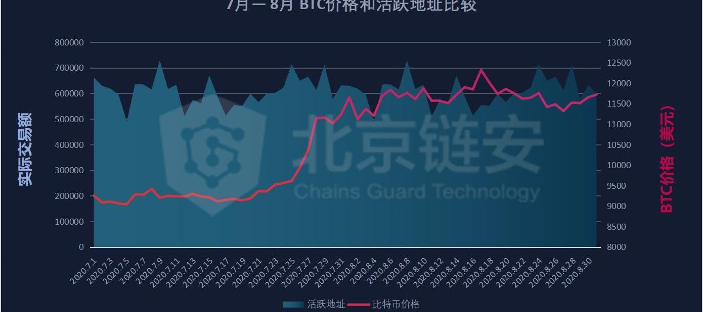 在突破1萬美元后,此前7月的大部分時間,比特幣價格可謂平淡無奇,持續在11000到12000美元間震蕩。進入8月,比特幣價格在短暫調整后,卻開始在震蕩中沖高,并在中旬突破12000美元關口,但是這個時刻并未維持太長,比特幣價格很快再次回到12000美元一下。在此態勢下,8月鏈上數據伴隨幣價更大幅度的波動,也較7月有所提升,接下來就讓我們對8月鏈上數據進行復盤和分析,看看在這個突破之月鏈上數據能否透露出一些信息。