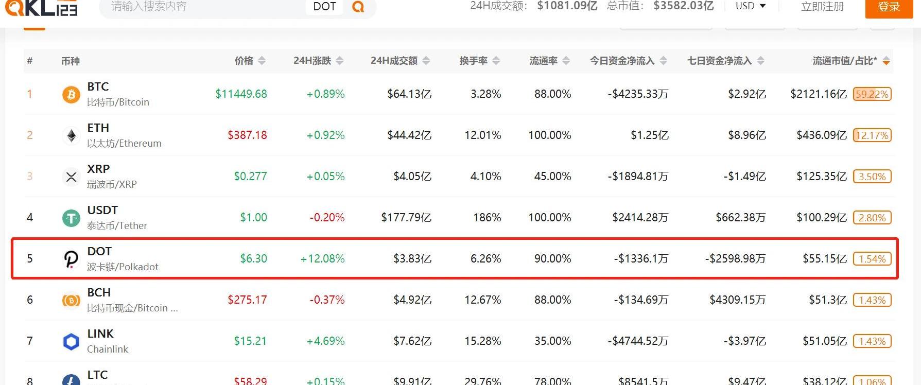 1.2萬美元已經成為BTC短期重要阻力位,昨日更是下挫至1.1萬美元。ETH和EOS等主流幣同樣下跌。萬綠叢中一點紅的DOT,用逆勢上漲給自己做了一波營銷。