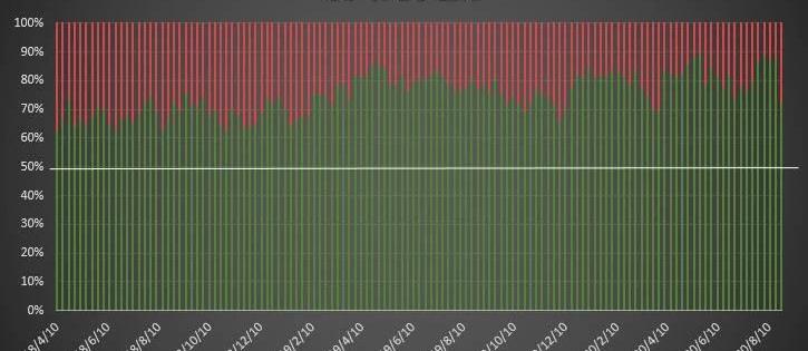 分項數據上來看,規模較大的經紀商持倉多頭頭寸296張并未進行調整,空頭頭寸自585張驟減至1張。大型機構的空頭頭寸在5月5日當周出現0值后,又在最新統計周期內出現了1,而且這一數據是從幾乎歷史最高點的水平直接幾近全部平倉得到的,這種相當激進的調倉值得高度關注。正如前文所述,行情快速回調階段市場進行減倉風控并不難理解,但是常規邏輯應該以與行情反向的多單減持為主,而大型機構在多頭頭寸沒有發生任何變化的情況下幾乎把空頭頭寸全部了結,某種程度上是進行了果斷的「獲利了結」處理,而并不看好行情在未來進一步走低。至少從最新一期的調倉情況上來看,大型機構對于市場的信心已經快速回歸,短期內的這種平空留多演繹是對于后市行情止跌反彈極其自信的表現。