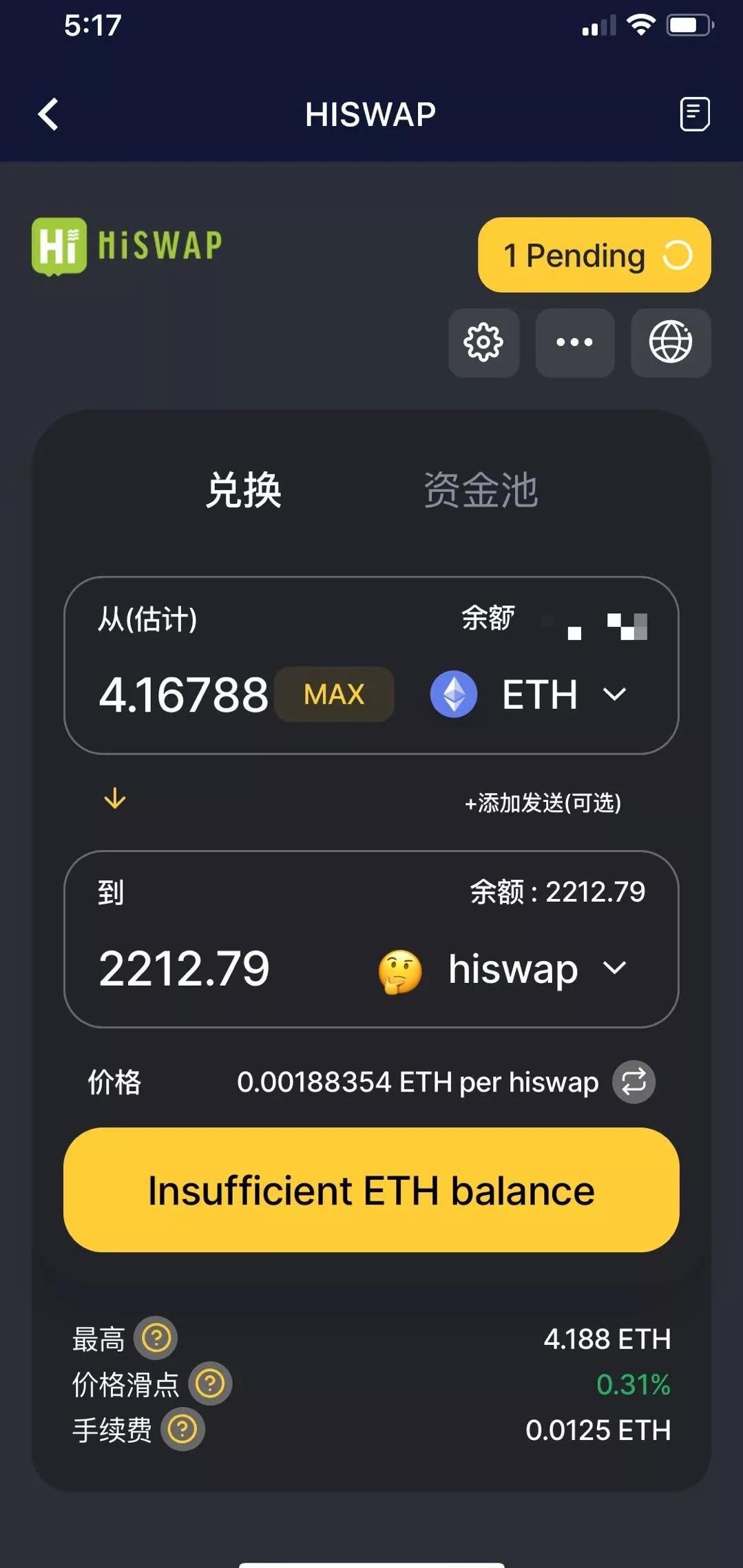 我8月2日下午4:48分打入了3.893個ETH,下午5:17分除去以太坊網絡比較高的手續費用,賬戶里的HiSWAP也已經增長了約0.2ETH,而這僅僅花了不到半個小時,然后又過了40min,賬戶變為如下圖片: