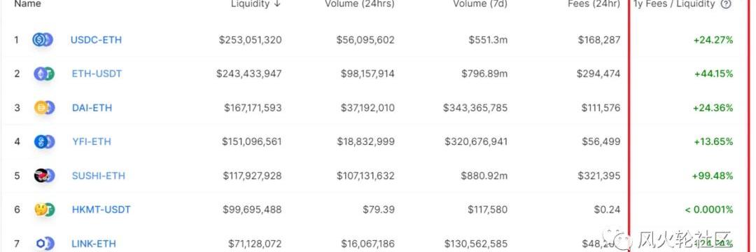 這種方式使得我們只需要有一個基礎的資金池,就可以開始任何兩類幣間的交易,而所有愿意把資產存進來的人,就可以做這些交易對的流動性做市商。對于做市商,這里沒有交易所或項目方的付費,但可以按資金比例,分潤平臺的0.3%的交易手續費,而隨著流動性挖礦熱潮的開始,這里就演變成了,抵押資產到資金池,除了交易手續費,還分你另外一個激勵代幣。那么你的做市收益=0.3%手續費分潤+分得的代幣*單價如果這個平臺相當于“去中心化交易所的幣安”,流量很大,交易很活躍,這個手續費分潤其實就還可以了,像現在的uniswap上是完全沒有其他激勵的,下圖紅框中畫的是這些交易對現在存入做市的年化收益: