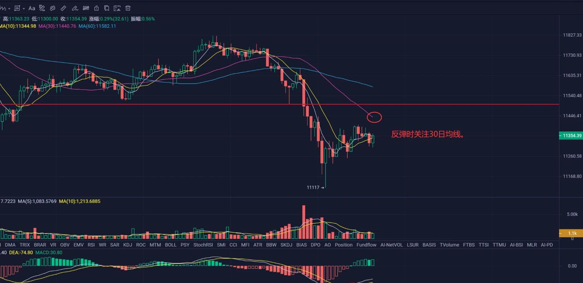 所以我們先關注30日均線附近的壓力位,大致在11400-11450美元區間,下方支撐位先看昨天的低位,再看11100美元。當前確實有部分小伙伴進行抄底,但是我們介意還是先順著當下的趨勢看待行情,即使是長期看漲的,也先等信號出現再介入,雖然可能會損失部分利潤,但更能避免許多潛在的風險。