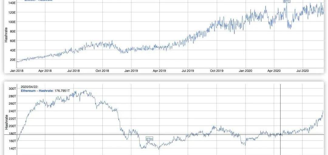 比特幣采用的是SHA-256加密算法,在挖礦的時候,比拼的是算力。為了提高算力,比特幣經歷了CPU挖礦、GPU挖礦、FPGA礦機挖礦和現在的ASIC礦機挖礦四個階段,專業化程度越來越高。以太坊采用的是Ethash加密算法,在挖礦的過程中,需要讀取內存并存儲DAG文件。由于每一次讀取內寸的帶寬都是有限的,而現有的計算機技術又很難在這個問題上有質的突破,所以無論如何提高計算機的運算效率,內存讀取效率仍然不會有很大的改觀。因此,從某種意義上來說,以太坊的Ethash加密算法具有“抗ASIC性”。加密算法的不同,導致了比特幣和以太坊的挖礦設備、算力規模差異很大。目前,比特幣挖礦設備主要是專業化程度非常高的ASIC礦機,單臺礦機的算力最高達到了110T/s,全網算力的規模在120EH/s以上。以太坊的挖礦設備主要是顯卡礦機,專業化的ASIC礦機非常少,一方面是因為以太坊挖礦算法的“抗ASIC性”提高了研發ASIC礦機的門檻,另一方面是因為以太坊升級到2.0之后共識機制會轉型為PoS,礦機無法繼續挖。和ASIC礦機相比,顯卡礦機在算力上相差了2個量級。目前,主流的顯卡礦機算力約為420MH/s,以太坊全網算力約為230TH/s。從過去兩年的時間維度上看,比特幣的全網算力增長迅速,以太坊的全網算力增長相對緩慢。