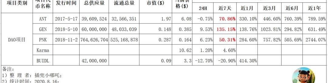 2020.8.9日,ETH上的BTC錨定幣總發行量為21923個,其中,WBTC16472個,renBTC2570個。2020.8.16日,ETH上的BTC錨定幣總發行量為38142個,其中,WBTC26161個,renBTC7721個。也就是說,過去一周遷移到ETH上的BTC增長了73.9%,其中,WBTC增長了58.8%,renBTC增長了300%。因此,這兩天REN的價格表現非常贊。ETH上的DeFi在發展,BTC要遷移到ETH上,那么ren這個中間橋梁將起到很大作用。三、DeFi及DAO代幣數據表現