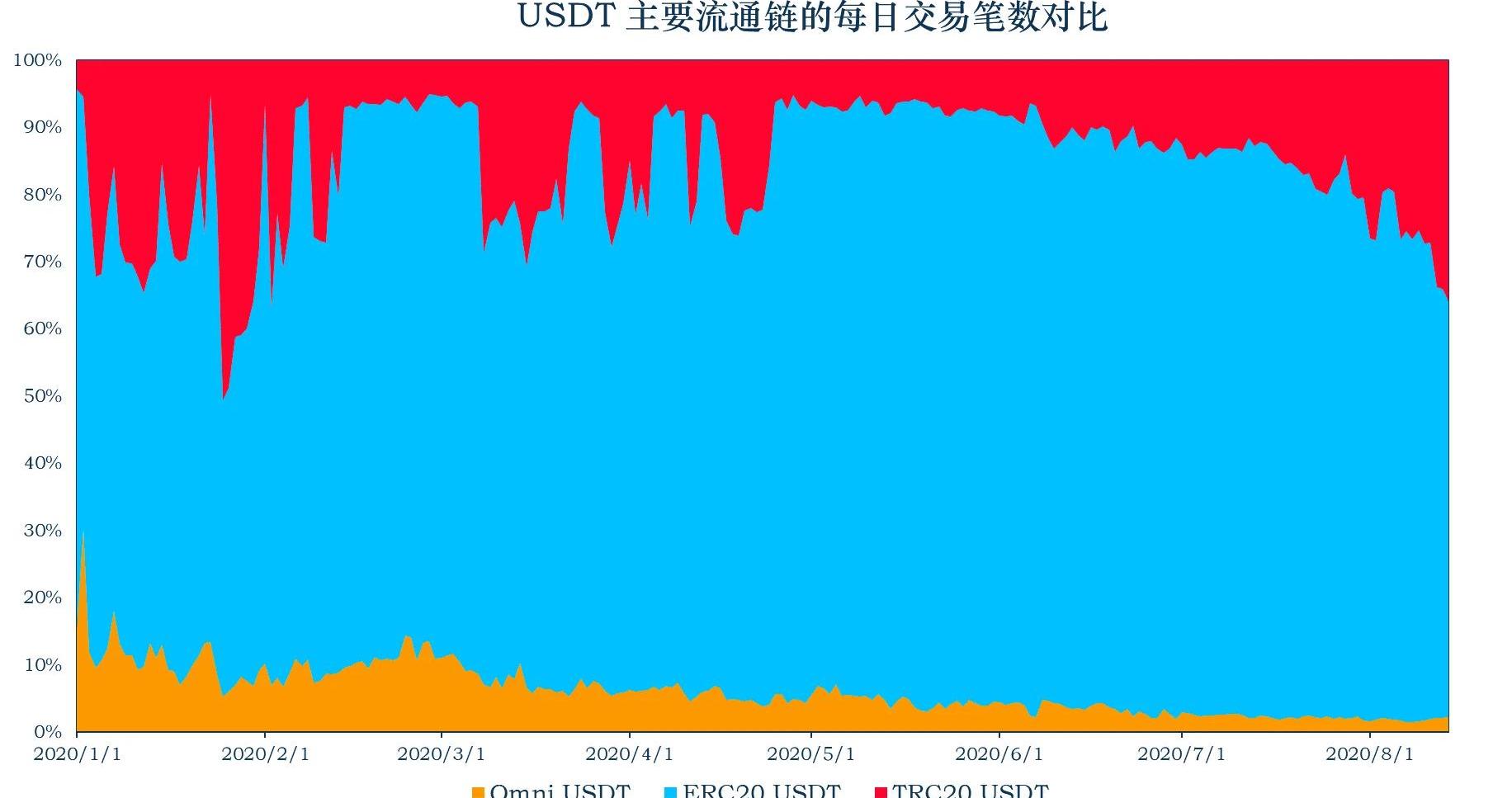 來源:MYKEY,CoinMetrics同樣的情況也發生在交易筆數上,從今年6月份開始,TRC20USDT在USDT交易筆數中的占比也不斷上升,現在已經升至35.9%。年初的時候,TRC20USDT的交易筆數是ERC20USDT的5.34%,現在這個比例已經升至58.04%。