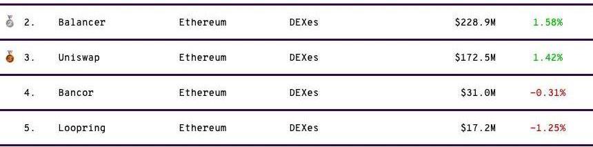 資料來源:AaveWatchCompound的增長源于流動性挖掘,而Aave在沒有任何有意義的代幣激勵的情況下取得了成功。無論增長是否是由流動性挖礦引起的,Compound的數據都表明,與Aave相比,其市場更大,利用率更高。本質上,如果Compound的供應量為1000億美元,而借款人獲得了990億美元,但Aave的供應量為100億美元,而借款人利用了10億美元,那么TVL仍然將Aave的收入排在Compound之上。TVL指標對Compound具有更多的貸款來源進行了懲罰。這類似于說一家銀行比另一家銀行更好,因為它發行的貸款較少,因此有更多的流動性來迎合未來的借款人。而對于Synthetix,TVL是協議中所抵押SNX產品和SNX的市場價格。如果Synthetix上的活動停滯不前,但是SNX的價格上漲了30%,那么假設SNX的抵押保持不變,TVL也將上漲30%。同樣,如果抵押的SNX百分比下降,TVL也會下降類似的幅度。Synthetix協議的增長并不主要取決于生態系統中有多少抵押品,而取決于合成資產被鑄造的數量和交易所的交易量。雖然抵押品鎖定是必不可少的,因為它會固有地增加可以發行的合成資產數量,但TVL無疑是一個跟蹤這個協議增長和使用情況的錯誤指標。對于Uniswap,Curve和Balancer等自動市場做市商,TVL衡量交易者可以利用的流動性量。盡管這很重要,但它并不能固有地衡量所創造的價值。TokenTerminal顯示Uniswap的年化收入為1.11億美元,而Balancer為3080萬美元。盡管Balancer的TVL比Uniswap高33%。此外,連接到大量DeFidApp的KyberNetwork等流動性聚合商從這些來源獲取流動性,因此流動性并未鎖定在協議中。但是,與Bancor相比,Kyber通常可以提高交易量并產生更多收入,而后者的TVL卻是Kyber的3倍。