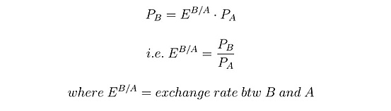 假設任何兩個經濟體的商品產出都是可替代的,因此商品的價格差異可以被套利到一致(這在很多情況下顯然不是真實情況,但只要大方向正確,就不會影響我們的推演目的),A國和B國的價格水平之間的關系是: