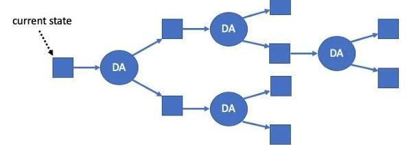 我在這篇文章中介紹的新的ArbitrumRollup協議解決了上述兩個缺點。多個DA可以被"管道化",這樣一個虛擬機的進度就像驗證節點可以模擬虛擬機的計算一樣快。其次,正如我們在下面會看到的那樣,一個惡意行為者不能減慢進度,他們只能暫時延遲鏈上對結果的認可,而這些結果對誠實的各方來說已經是"不可信的最終結果"。那是怎么做到的呢?讓我們來挖掘一下新協議......每個狀態最多可以有一個DA跟隨它。如果一個DA沒有跟隨狀態,那么任何人都可以創建一個跟隨它的DA,創建一個新的分支點。結果將是一棵可能的未來樹。