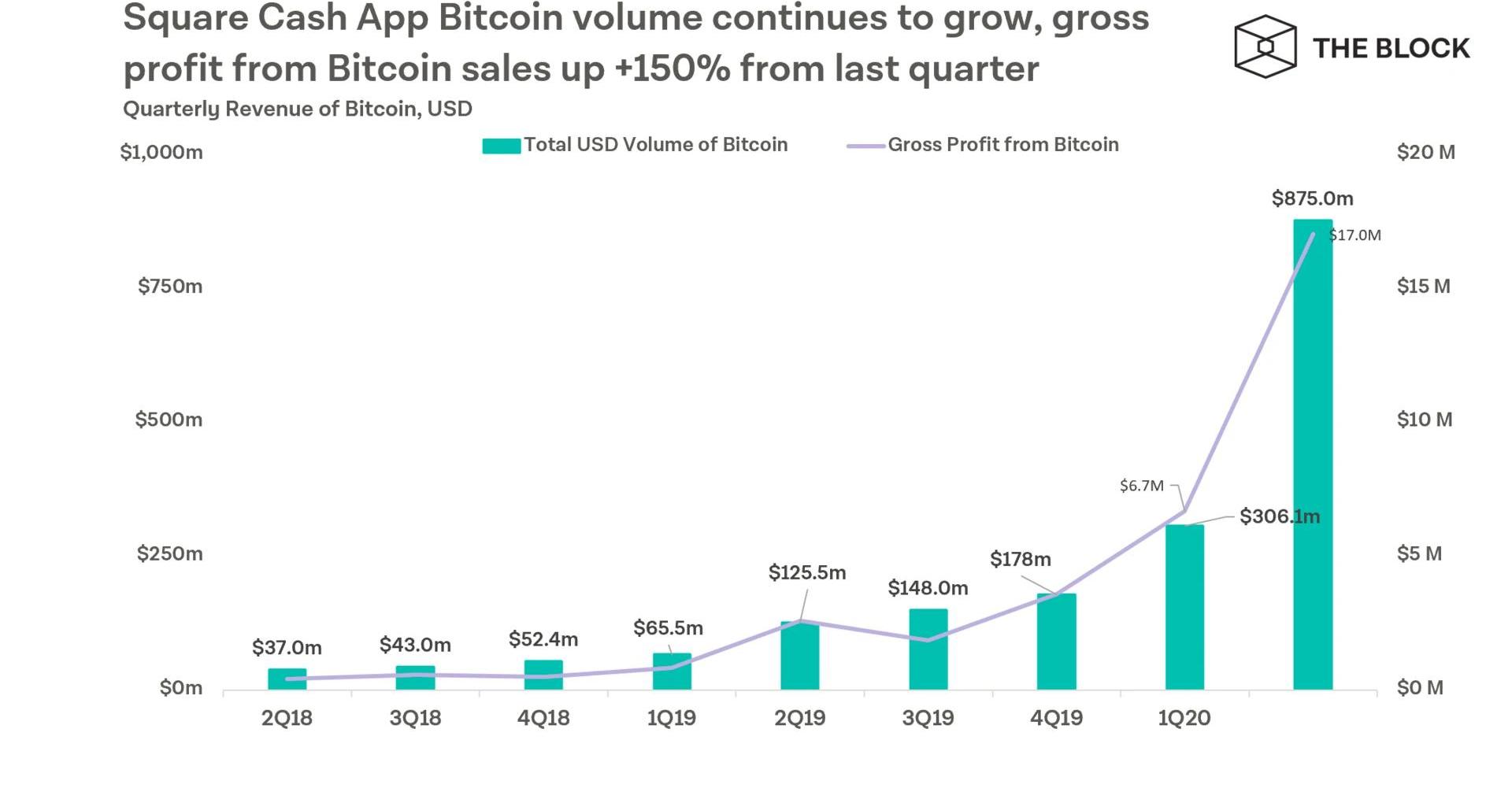 如果ETHE通過SEC該注冊申請,將會被提前釋放的ETHE份額2、Square過去12個月購買了價值約15億美元比特幣據Dailyhodl8月6日消息,美國零售支付巨頭Square在過去12個月中購買了價值約15億美元的比特幣,以促進其移動應用程序上大量的客戶需求。這些BTC購買大部分發生在最近一個季度。此外,Square8月4日表示,2020年第二季度CashApp服務實現了8.75億美元的比特幣成交額,產生了1700萬美元的比特幣毛利潤,同比分別增長600%和711%。CashApp是總部位于舊金山的金融服務和技術公司Square旗下的一款多功能的轉賬支付軟件,從2018年接入一鍵購買比特幣功能以來,通過這款軟件銷售的比特幣,每年都在以超過100%的速度增長,2020年第一季度的比特幣成交量幾乎比肩灰度。歷史數據顯示,CashApp在2020年第一季度的比特幣交易額為3.061億美元,毛利潤700萬美元,第二季度CashApp服務實現了8.75億美元的比特幣成交額,產生了1700萬美元的比特幣毛利潤——手續費真的不低。