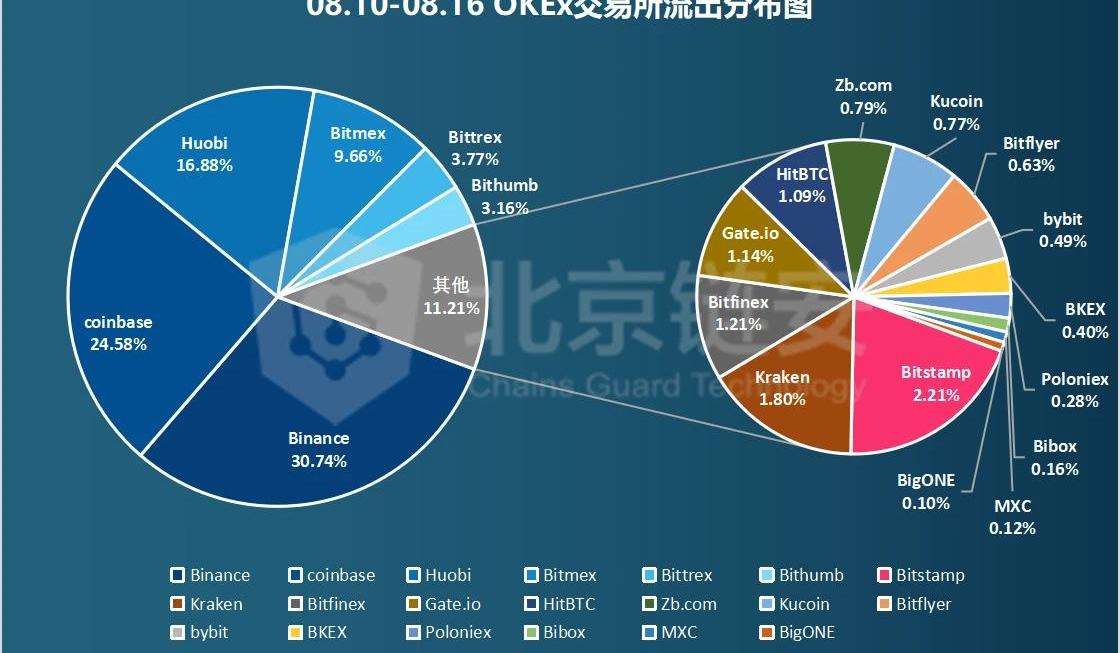 火幣的比特幣凈流出在上周有所放大,一個側面體現是火幣交易頻度極低且極少轉出比特幣的冷錢包在8月14日到8月15日連續以1000BTC為單位發起8筆轉出交易,累積轉出8000BTC到熱錢包中。不過,火幣的冷錢包地址依然存儲著247502枚比特幣,依然是目前比特幣儲幣量最大的地址。三大交易所流出分布:在過去一周,交易所之間的比特幣來往又呈現怎樣的分布呢?我們將幣安、火幣、OKEx三大交易所流出到各交易所的比例在這里也向各位呈現:注:以上比例根據各交易所流出到已確定主體地址中的分布計算,排除了未確定主體的地址和獨立地址,即在交易所流出的所有比特幣中,相關主體的實際占比會更小一些。