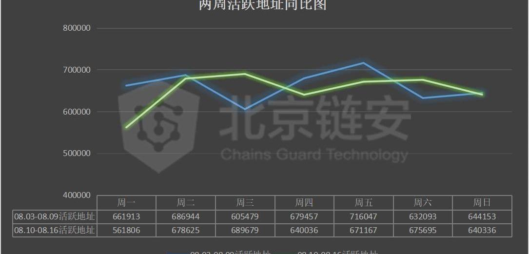 活躍地址數:08.03-08.09:462608608.10-08.16:4557344較之前一周下降:1.49%詳細數據圖如下: