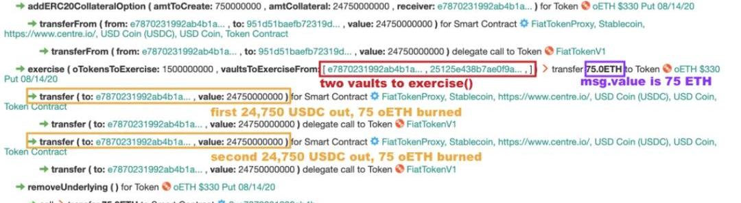 圖3.攻擊交易分析在圖3中,我們通過Bloxy瀏覽器顯示的調用過程來展示攻擊的過程。由于攻擊者吃掉了很多筆訂單,我們以其中一筆交易為例,向大家展示其攻擊邏輯:1、攻擊者先從Uniswap購入了75oETH為進一步調用函數行權做好籌備;2、攻擊者創建了一個Vault地址,作為看空期權賣方,并且抵押24,750USDC鑄造出75oETH,但并未賣出這些期權,等于自己同時買入了以330的價格賣出75ETH的權利;3、攻擊者在Opyn合約中調用了exercise(),在持有150oETH看空期權的情況下,先向自己的Vault地址轉入了75個ETH,獲得自己事先抵押的24,750個USDC,再重利用了這75個ETH,成功吃掉了另一個用戶的24,750個USDC,進而實現非法獲利。修復建議