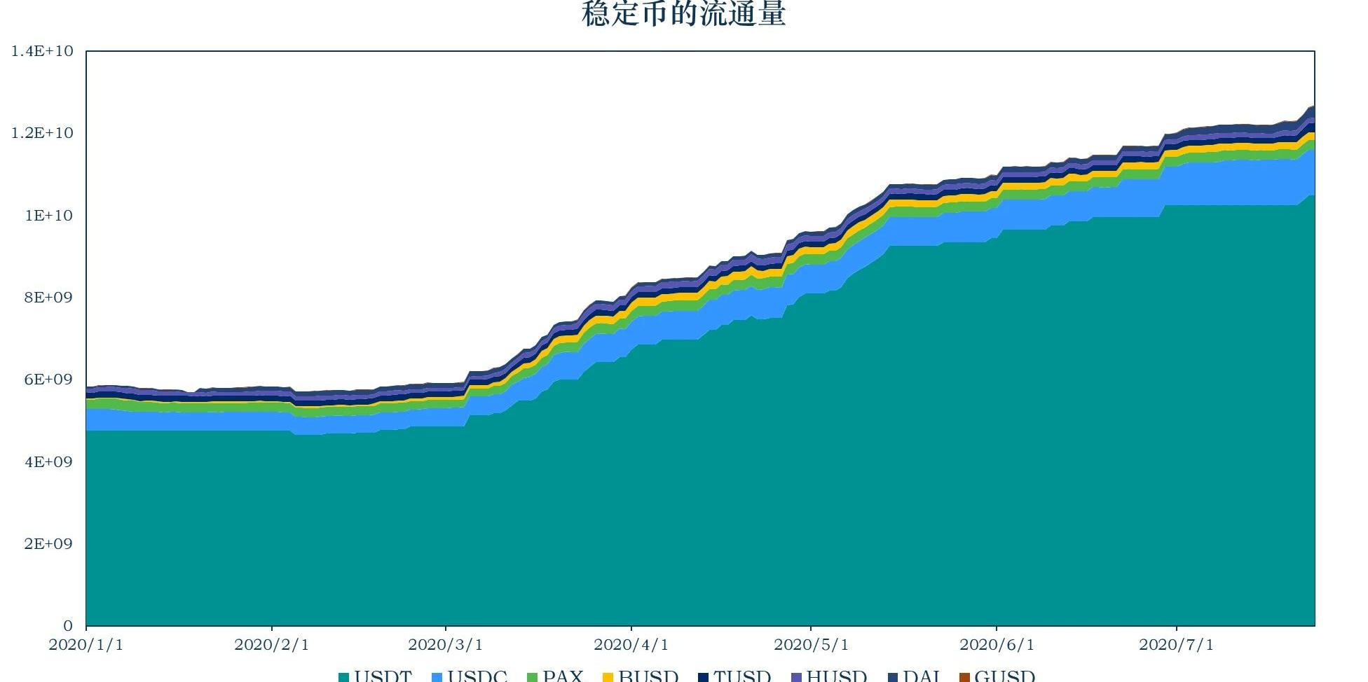 XRP/HKD-2.8%作者:MYKEY研究員蔣海波快速預覽上周,主要穩定幣總市值增長4.65億美元,達到126.84億美元。USDT的流通量在暫停增長20多天后,上周在ETH和TRON上各增發1.2億美元。TUSD的流通量增加1.06億,DAI的流通量增加了7754萬。TUSD與DAI的流通量相比一周前分別增長79%和37%。DAI的交易額占比上升,USDT的交易額占比下降。6月23日-7月23日,AMPL的流通量從561萬升至1.5億;價格從1.01美元升至1.98美元;流通市值從567萬美元升至2.96億。6月23日-7月23日,持有AMPL的收益為51.28倍,但是AMPL的價格只上漲了不到一倍。一、穩定幣數據概覽