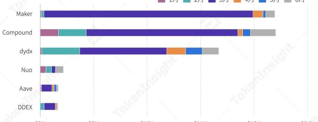 312極端行情下DeFi市場清算額,來源:DeBank;TokenInsightTokenInsightResearch收集并統計了6個主流借貸平臺在2020年上半年的清算額,結果如下圖所示。ETH暴跌后,所有借貸平臺在3月出現清算量激增。3月6家平臺共計清算量為4246萬美元,其中Maker平臺的清算量高達1875萬美元,占比44.16%;其次是Compound,其3月清算量為1365萬,占總清算量的32.15%。