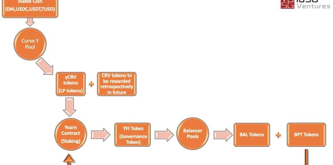 來源:DuneAnalytics隨著DeFi市場的規模不斷擴大,隨之而來的是其復雜性的增加,因此,我們認為能夠緩解用戶與DeFi協議之間互動復雜性的的產品需求將會不斷增加。這種項目包含能夠實現“一鍵”訪問所有DeFi協議的用戶聚合器將迎來增長,并可能在吸引新的加密貨幣用戶方面發揮重要的作用。雖然有越來越多的協議加入到了流動性挖礦的熱潮,但尋找到最有利可圖的機會并不容易。我們認為會有更多項目開發類似收益率聚合器的產品,從而幫助用戶提高收益率。下圖展示了yearn如何與多個DeFi項目交互。我們可以看到,yearn實際上集成了DeFi領域諸多協議讓流動性提供者的回報最大化,并通過治理代幣將產品和用戶的利益深層次綁定。我們預計在DeFi的應用層會出現更多專注于收益率優化的的項目來吸引注重短期利益的交易者。