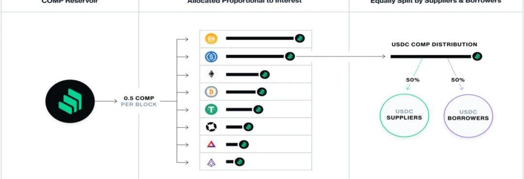 來源:CompoundMedium在Compound的流動性挖礦中,總共4,229,949個COMP代幣將放入“蓄水池”合約中,并按50/50的比例分配給存款者和借款者。代幣將在4年內被完全自動化的分發。目前每個以太坊區塊將分發0.5COMP(意味著每天發放2,880COMP)。Compound用戶只需簡單地通過向系統借出/借入數字資產,便能基于資產的價值賺取COMP。一旦某個地址累積的COMP代幣達到0.001,此后在Compound平臺進行的任何交易,系統將會自動把待領取的COMP轉移給用戶。若累積COMP代幣小于0.001,用戶有權手動領取COMP。最近海外社區都喜歡把流動性挖礦稱為“YieldFarming”,不僅指通過Compound交易并賺取COMP,它還代表了使用加密貨幣并從中創造最大回報的策略。YieldFarming的例子包括:為了獲得更高的收益率,將資金轉移到風險較高的借貸池。采取不同的交易策略。例如,到其他協議中進行套利,把借出的資產抵押并借出其他資產,并將借出的新資產重新投入到借出池中,以獲得更高的收益。