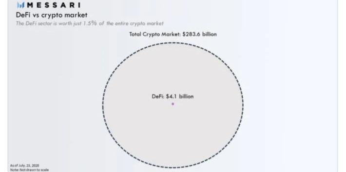 在瘋狂的上漲和喊單中,始終有一個問題盤旋在新玩家頭頂:這玩意兒為什么能漲,為什么漲這么猛?不過,如果你真去問這個問題,估計沒有人會嚴肅認真地給你答復,或許有人會反問一句:比特幣為什么上漲?對于YFI來說,挖礦基本上被大戶所把持,散戶小資金挖礦,收益都還抵不上手續費。雖然是一個去中心化的產品,但卻并非一個公平的游戲。所以,在FOMO情緒濃厚的二級市場接盤成為更多人的選擇。大戶挖礦,社區喊單,散戶接盤,你拋售籌碼,我接過來,再賣給他,把人氣聚攏,把盤子做大……剝離開DeFi、流動性挖礦、社區治理、DeFi界的比特幣等等這些光鮮的外衣,你不得不承認,站在面前的YFI和YFII就是兩個高門檻的小眾資金盤。就是在這種喊單和接盤中,被創始人直言沒有價值的代幣,在喧鬧聲里從小眾的“實驗”變成大眾的狂歡。當然,用“大眾”這個詞也并不合適,因為直到目前,YFII的持幣地址只有1300多個,池子的資金量不過1.5億美元左右。和剛剛被搗毀的PlusToken200萬人和400億的傳銷規模不能比,更不能和比特幣2000億美金的市值相提并論。不過在一些人看來,星星之火,可以燎原。因為雖然YFI和YFII的參與人數和資金規模不大,但發展速度卻十分迅猛。另外,社區規模也在擴張,YFII這個起源于海外,發展于本土的項目,如今正在反向輸出,用社區成員的話來說,要讓外國人接盤。YFI的創始人Andre估計都想不到,劇本會朝這個方向發展。前不久有國外機構的研究人員做了一張非常形象的圖片來說明DeFi在加密貨幣市場中的規模。