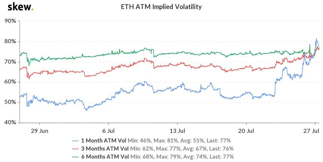 ETH歷史波動率10d81%30d58%90d67%1Y101%以太坊是本次拉盤的龍頭,可能和最近的市場熱點消耗ETH較多有一定關聯。以太坊的各項數據可以稱之為勢如破竹。各標準化期限IV:今日:1m79%,3m76%,6m76%7/23:1m70%,3m72%,6m75%以太坊的期權市場走出了獨立強勁的走勢,短期隱含波動率高于中長期,而波動率期限結構開始變形了。主要交易力量在買進看漲期權賣看跌期權,我們稱之為領口策略。