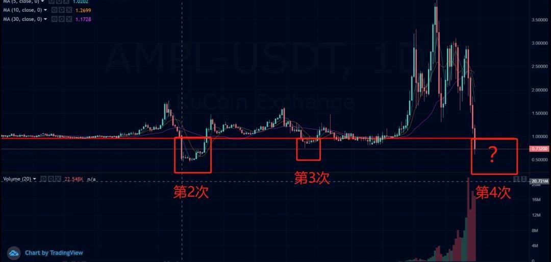 AMPL官網顯示的價格K線圖是AMPL24小時的量價加權均值,在這張圖中還沒有體現出第4次死亡螺旋,關于這個可以參考庫幣上AMPL的K線圖,如下。