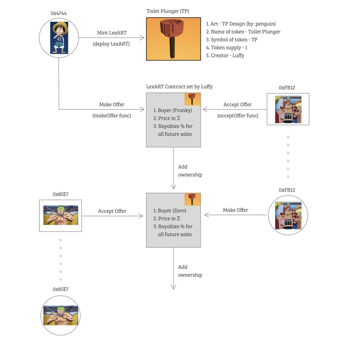 我們從路飛開始,海賊王的主角。路飛是草帽海盜團的船長。他偶然發現了企鵝創造的一些很酷的設計,并決定把它通證化。他通過具有必需名稱、符號等信息的LexART智能合同來鑄造馬桶活塞通證(TP)。TP是唯一的。這是一個ERC20通證,其供應上限為1。路飛最初打算用TP來設計有史以來最好的馬桶活塞來保持海盜船的清潔。他有一個更宏偉的夢想但卻沒有多少時間,所以他決定把它賣給他的船員弗蘭奇。弗蘭奇是鋼鐵俠,但用可樂作為燃料。路飛認為這個設計將有助于發明新的武器。第二步