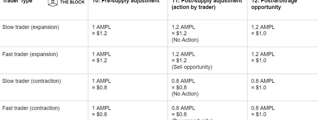 據Ampleforth的開發者介紹,這個系統主要有兩個好處:鼓勵一個穩定的單價它運用了逆周期的壓力(counter-cyclicalpressure)。這意味著,如果價格下跌,AMPL的動態會限制價格的下跌,反之亦然。第一條沒有問題,因為如果你想把波動性從價格轉移到供應上是可行的。如果比特幣在每個錢包里的供應量在價格翻倍時也翻倍,那么比特幣的單價就會保持相對穩定。供應量可以因為任何原因進行調整。例如,Polkadot正計劃用100倍或1000倍的分割來重新定義DOT代幣的面額。這樣做的理由是它減少了對小數點的需求,從而提高了可讀性。這也有心理層面上的好處,就是人們現在能夠買得起一整個DOT代幣了。但其實唯一有用的只是增加了那些不懂的用戶的投機行為,因為重定面額并沒有對Polkadot的價值帶去什么改變。但第二條有沒有道理呢:將波動率從價格轉移到供應量上,是否有任何經濟上的用處呢?Ampleforth針對逆周期行為提出的主要論點是,當價格上漲時,賣出的動機就會增加,當AMPL價格下降時,買入的動機會增加。這意味著給快速交易者創造了一個套利機會,讓他們在AMPL的市場價格還沒有來得及調整之前獲取利潤。有人認為,這種動態使得AMPL在加密投資組合中作為一種有用的對沖工具,因為加密貨幣通常是相互關聯的,當加密貨幣價格下跌時,AMPL價格會上升,因為AMPL的價格會回歸平衡。此外,這可能幫助AMPL成為MakerDAO等系統中非常有用的抵押品類型,因為它可以抵消ETH等抵押品的下跌。此外,AMPL的目的就是通過供給調整來抵消失控的通貨膨脹和通貨緊縮。Ampleforth通過"慢"和"快”兩者交易者對價格和供給變化的反應作為例子來說明這一點。下表展現了“Ampleforth逆周期的邏輯“。