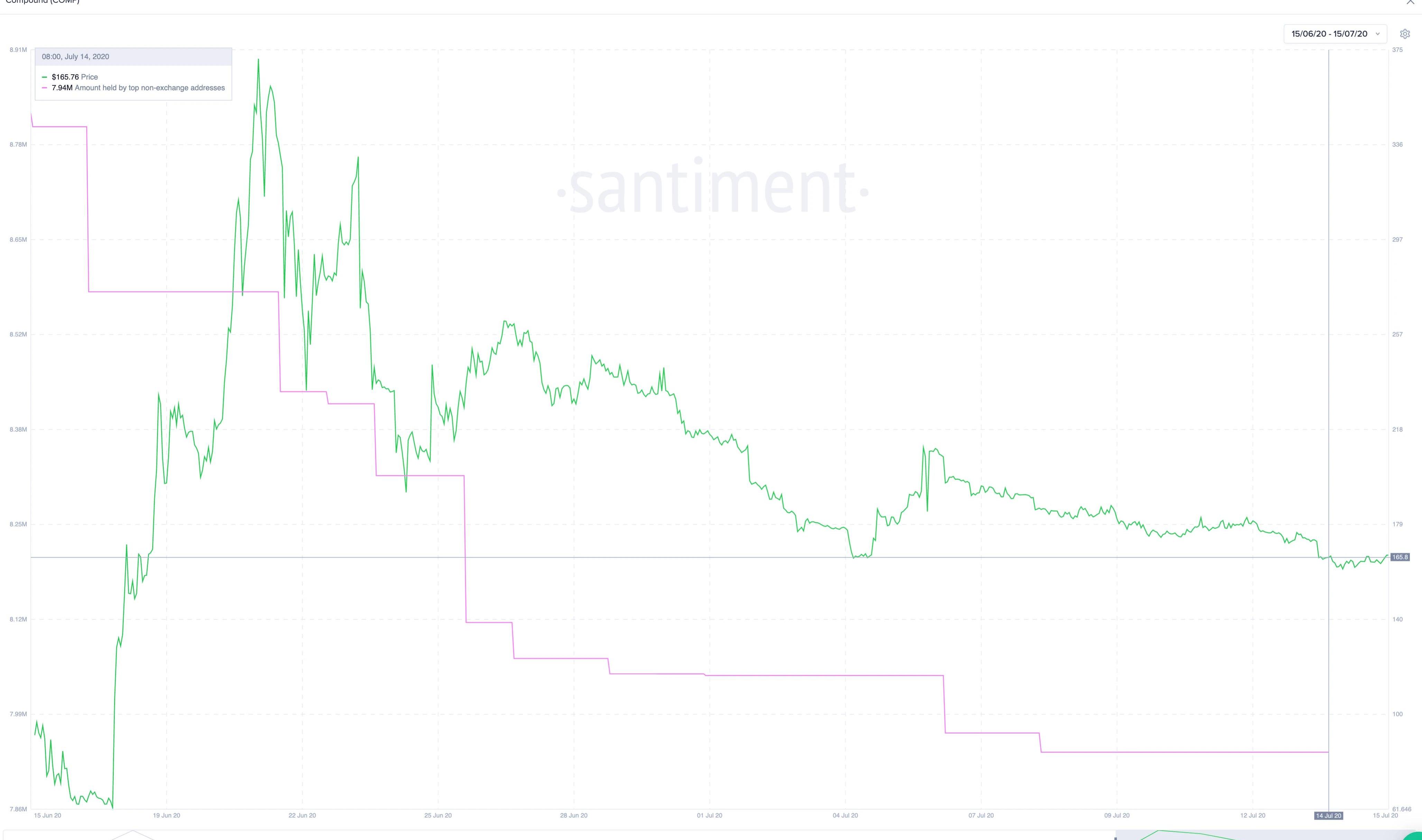 自COMP上線以來,前10大非交易平臺地址一直在減持,律動發現而且每次減持后,價格不久就會下跌。他們總共售出了87萬機枚COMP。但他們動作并不大,而且自7月8日以來就一直沒有新的活動。