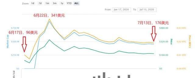 上圖是COMP的幣價走勢,它從6月17日上市之初的96美元,在不到一個星期迅速飆高到6月22日的341美元,再到7月13日的176美元。幣價已經距最高點回落了將近50%,距上市之初,價格翻了一番。我們再看看BAL的走勢:
