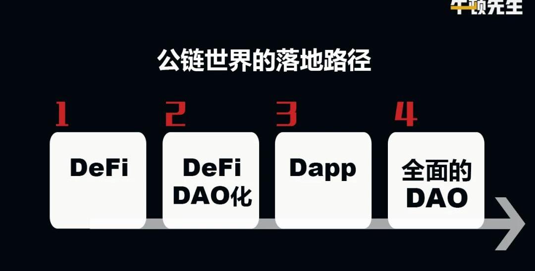我個人判斷,未來會分成四步到來:DeFi的落地。DeFi的DAO化。DAO不會一次性落地,它會先從一個龐大組織的一部分治理問題入手。而DeFi協議以及數字資產上鏈后的治理問題,會率先使用DAO的形式進行相應治理;Dapp的落地。伴隨著區塊鏈技術的成熟,M2M的成熟,通訊技術的成熟,Dapp會卷土重來,不同的是,那一次Dapp會真正落地走入我們的生活;全面的DAO落地。DeFi和Dapp的落地為DAO的全面落地提供必要土壤,而DeFi的DAO化為DAO的全面落地提供經驗,那時候,全面的DAO時代將會到來。人這一輩子沒幾次機會能趕上時代級的變革,DeFi絕對算一次。也只有這樣的機遇,一個人的經歷才有可能成為一個行業的歷史。