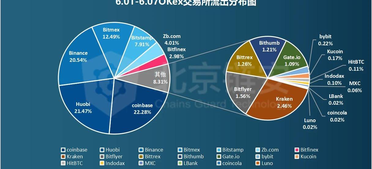 一個明顯的趨勢就是,其用戶比特幣向火幣的流向比例在逐步增加,在第三周已經超過了50%,由于兩家交易所的用戶中,亞洲用戶占比較大,這一趨勢似乎體現出近期交易所巨頭間的階段性格局。我們在這里總結一下,看看6月前三周,三大交易所整體的比特幣流出分布: