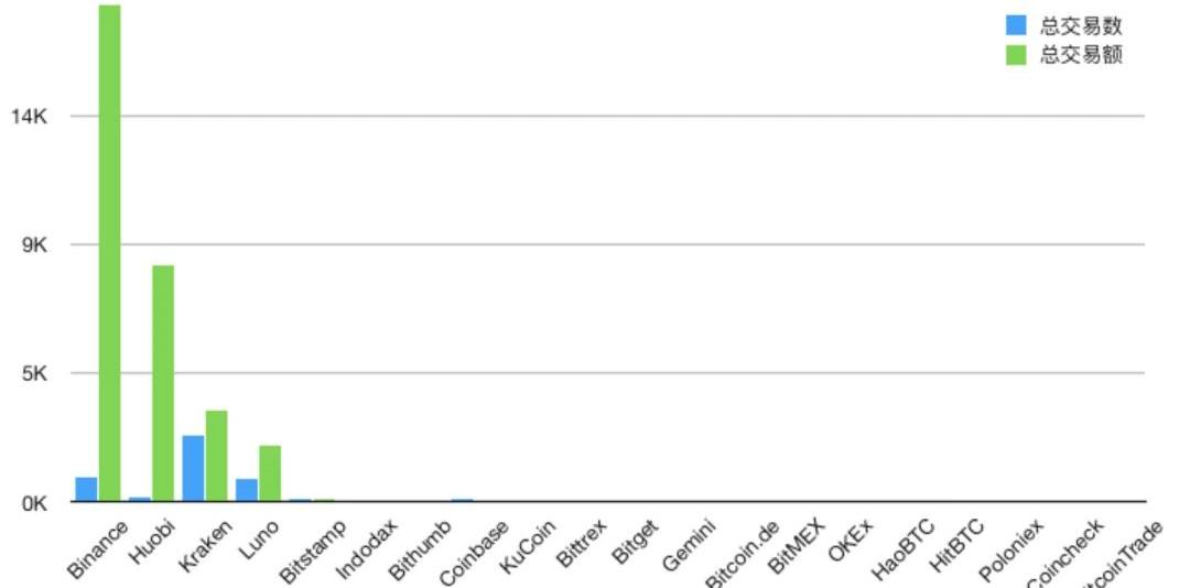 如圖十八所示,我們把涉及贓款最多的交易所做了排名發現,前十位的交易所分別為:Huobi、Binance、OKEx、ZB、Gate.io、BitMEX、Luno、HaoBTC、Bithumb、和Coinbase。