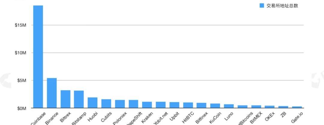 如圖二、圖三所示,我們對各個交易所擁有的BTC和ETH地址標簽進行了排行。BTC方面:其中Coinbase交易所擁有個1,851萬地址,排名第一位,Binance交易所擁有地址400萬個,排名第二位;排名第三位的是Bitstamp交易所,擁有地址265萬個;ETH方面:Bittrex地址擁有158萬個,排行第一位,ShapeShift擁有地址146萬個,排行第二位,Binance擁有地址142萬個,排行第三位。需要說明的是,查找交易所地址過程具有一定的復雜性,我們先要搜集一部分充提地址作為種子地址,然后再鏈上利用Cerberus工具,進行大批量關聯性的地址抓取、入庫,與此同時,我們同時會對所挖掘的地址進行必要的鏈下驗證確認,以確保地址的準確性。2.2交易所地址余額情況