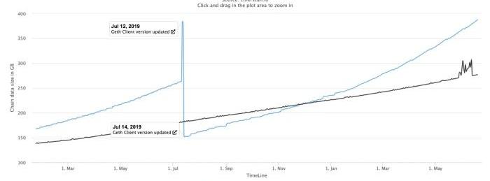 隨著越來越多的智能合約被部署,以及大量的合約互動行為,導致以太坊網絡需要儲存的「狀態」大小正以「等比級數」增長。狀態的增長即反映在節點的儲存空間大小上。