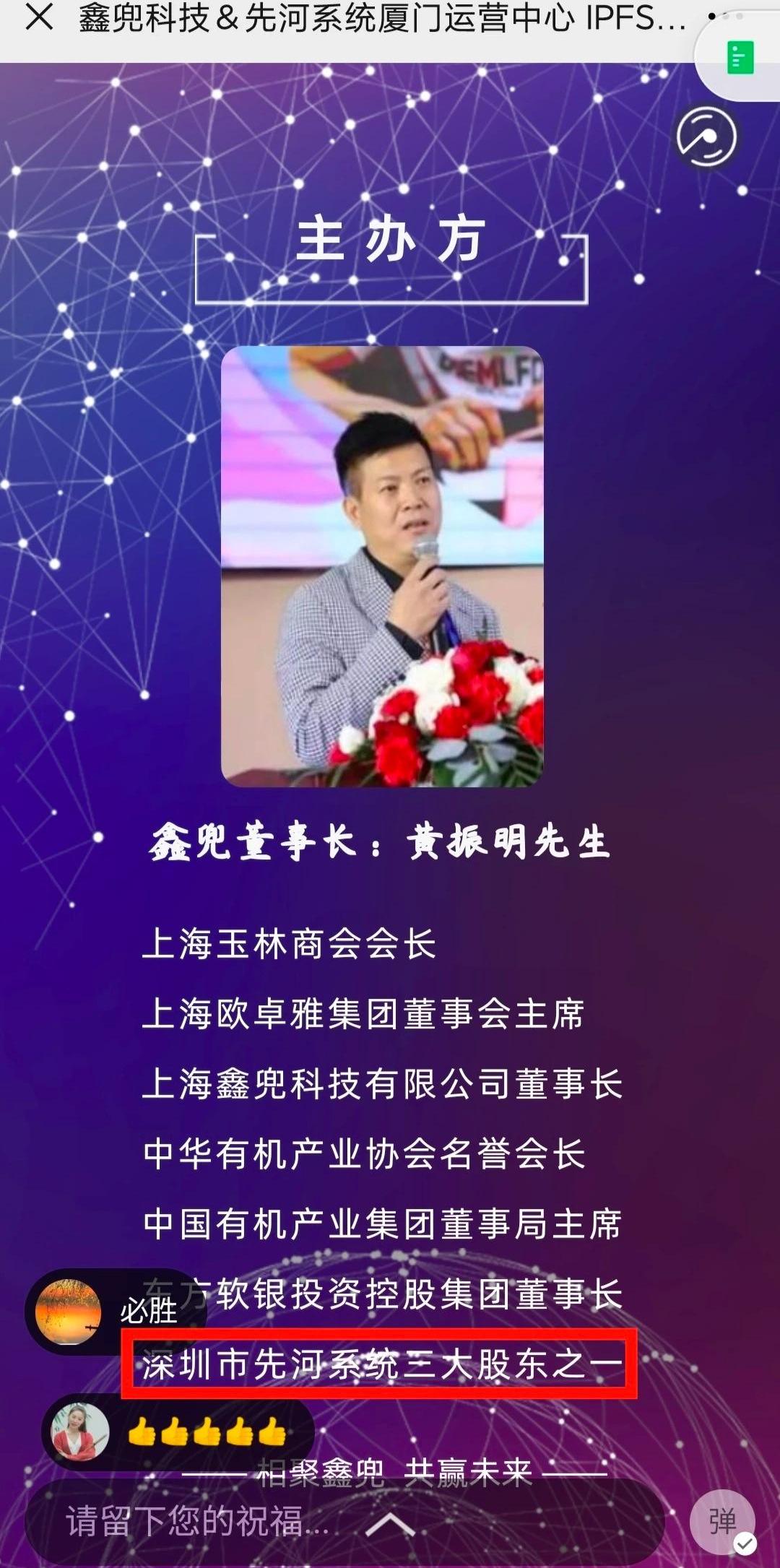關于先東和先河的關聯,我們無法從股權架構和核心成員中看出。但公開信息顯示,先河四大股東之一,持股25%同時兼任先河監事的黃振明,正任另一礦商鑫兜科技的法人和大股東。從宣傳來看,雙方聲稱共建“廈門運營中心”;而鑫兜在多處宣傳中也和先河深度綁定。