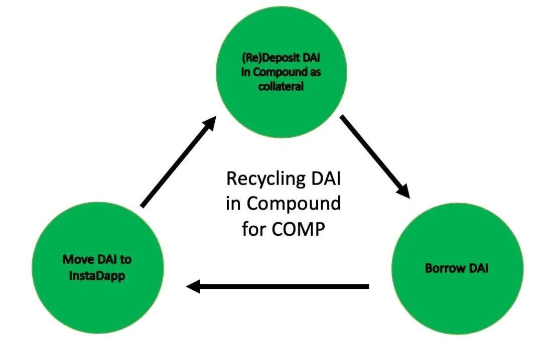 cDAI的市值目前是其相關DAI的8倍以上。這是由于Compound中的收益農場產生的意外后果。由于收益農場目前根據提供的流動性數量以高價值的COMP代幣進行獎勵,因此用戶有動力提供盡可能多的流動性。一般來說,流動性可以加強金融系統,并被視為采用的先決條件。然而,收益農場創造了一種不惜一切代價提供流動性的反常激勵,這導致用戶通過"回收"他們的DAI來利用這一計劃。從本質上講,用戶將DAI存入Compound賺取利息加COMP代幣,然后他們用這個DAI進行超額抵押貸款,借到更多的DAI,而這些DAI又被重新存入作為抵押品,以此類推。雖然這個過程不能直接在Compound內執行,但有幾個用戶一直在利用這個漏洞,將DAI轉移到其他DeFi協議,如InstaDapp。這個過程的簡化圖如下所示。