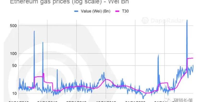 以太坊區塊鏈要考慮另一個重要方面是gas價格。與前幾個季度不同,在2020年第二季度期間gas價格突然激增,這可能是因為DeFi和DEX交易量暴漲所導致。然而,gas費用上漲對游戲類DApp影響非常大,直接導致二季度日常活動量減少80%。