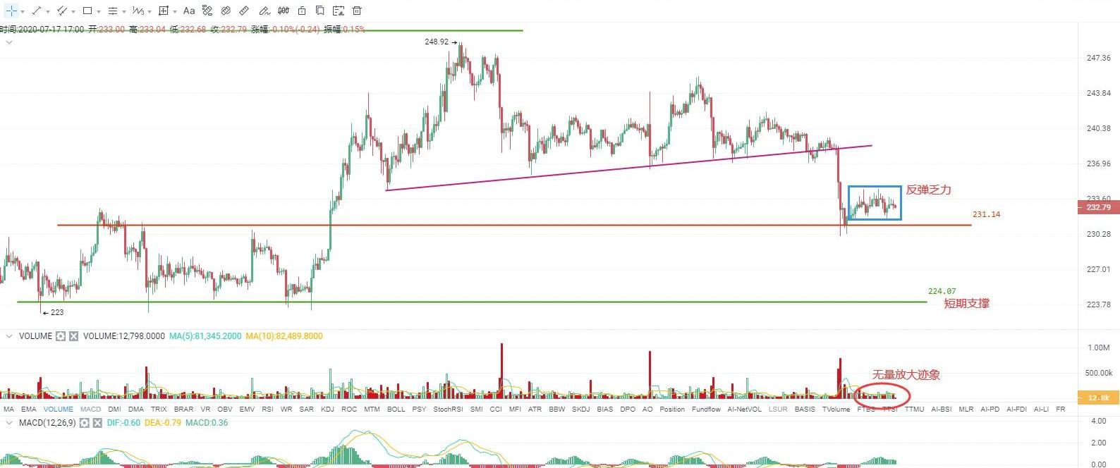 各級別性質:日線-盤整,4小時-盤整,1小時-下跌截圖來自OKEXETH/USDT永續合約1小時圖:目前的客觀走勢及應對策略:ETH目前的表現和昨日晚評說的一致,幣價在231支撐位附近進行窄幅盤整,反彈力度相當弱,K線上頻繁出現長上影,同時成交量也沒有放大跡象,多頭反攻無力。接下來的兩天建議可以關注235一線阻力和224支撐,如果價格靠近235后出現明顯滯漲回落跡象,或者仍遲遲不能上破235則可繼續持有空單或者新布局空單。若如預期向下,則關注幣價在靠近224附近后是否出現明顯止跌跡象,有則大概率再度反彈,可以考慮參與,沒有明顯止跌則不急于行動,則需要關注下一支撐217附近區域。主觀預期:預估未來兩天幣價會在測試224一線支撐后逐步止跌回升,屆時231一線則是反彈行情的強阻力位。本段不作為交易策略參考。阻力與支撐阻力:235--238--242支撐:231--224--217EOS/USDT永續合約