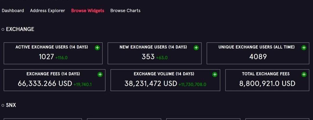 四、Synthetix_io作為三大Defi協議之一的Syntheti簡潔酷炫,設計風格是我喜歡的模樣。顯示了活躍使用者,新增用戶,產生的交易手續費,交易流通量,和各個地址交易數額等信息。