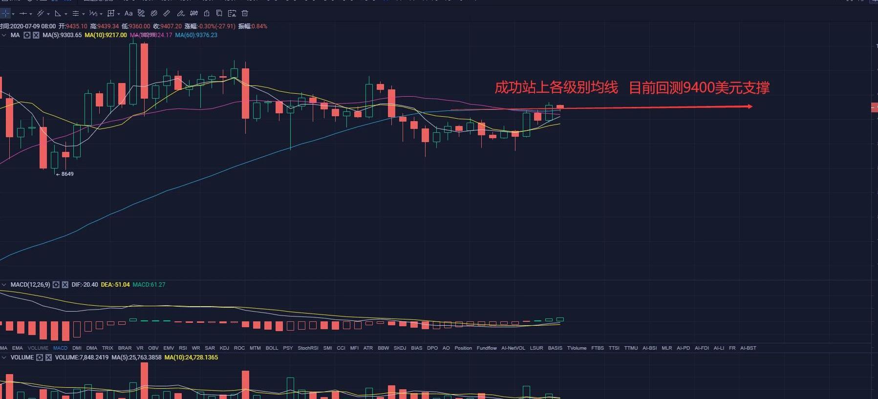 再從風險角度看,自從“312”以后,ADA上漲了7-8倍,接下去若是忽悠不到新的人進來接盤,上漲乏力的話,項目方或者莊家看到形勢無法更好會不會選擇套現?而且選擇到農村去宣傳基本上已經到了收割的尾聲,在這之后,再也沒有更多的資金能供使其更進一步。無論如何,像這種幣種我們一向不推薦大家接觸,當然,若是自己做好心理準備搏一把的話就要承擔套牢或者被收割的風險。回到行情上,昨晚比特幣再次上行直接到達9400上方,今日再次回測9400美元支撐。近期兩次上漲都是在A股白天強勢上漲后比特幣晚上跟漲的,所以不能說比特幣的上漲和A股沒有一點關系。日線級別昨日在突破9400美元支撐的同時也站上了各級別均線,同時量能也有所放大,僅從盤面上看,這是比較好的跡象,但目前仍不適合重倉介入。