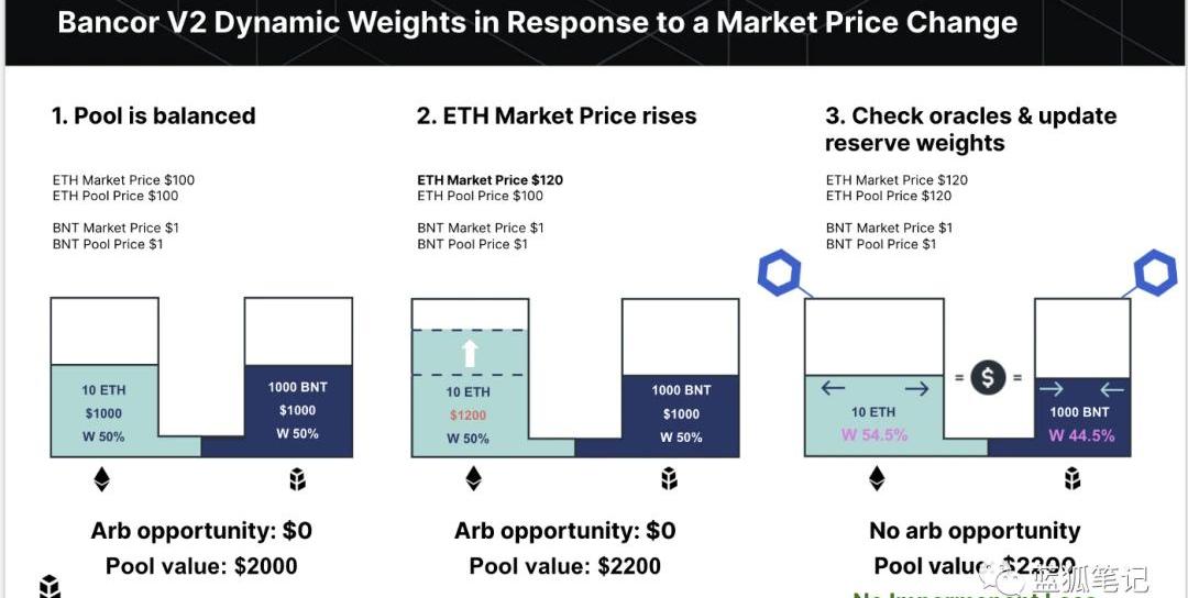 從圖中可以看出其核心有兩個:一是預言機提供最新價格;二是根據預言機價格更新代幣池比重,也就是動態池的模式。1.假設初始池為10ETH-1000BNT,其中假設ETH市場價格為100美元,ETH在代幣池中的價格也是100美元,BNT市場價格為1美元,代幣池價格也是1美元。也就是,假設ETH和BNT的市場價格和代幣池價格一致,那么,ETH-BNT池是2000美元流動性的代幣池,且不存在套利空間。2.ETH市場價格上漲。假設ETH市場價格漲至120美元,ETH代幣池價格為100美元,BNT市場價格為1美元,代幣池價格也是1美元。也就是,ETH市場價格上漲了20美元,那么,這個時候,就存在了套利空間。整個流動性池的實際價值為2200美元,而不是2000美元。3.為了防止流動性提供商產生損失,BancorV2通過獲取預言機價格,并升級代幣池比重。怎么升級?在獲取預言機提供的市場價格之后,ETH的池價格也升至120美元,那么,這個時候10ETH的代幣池價值為1200美元,1000BNT為1000美元,整個代幣池價值為2200美元,跟市場價值趨于一致。而更新之后,10ETH的占據代幣池的54.5%的比例,而BNT占據44.5%的比例。通過這樣的調整,作為流動性提供商,就不會因為ETH上漲產生“無常損失”。關于什么是無常損失,可以參考藍狐筆記之前的文章《Bancor有機會超越Uniswap嗎?》那么,這是相對比較粗線條的描述。具體來說,會有什么問題?對此,Balancer的CEOFernando提出了不同的看法:動態代幣池的概念很有意思,其核心是實現代幣池價格和鏈上預言機價格的一致,不過,可能會存在預言機價格延遲的問題。當ETH市場價格上漲至120美元,這會導致交易者立即套利并將價格推至120美元。預言機價格依然滯后在100美元。這會導致將價格重新變為100美元,這會產生第二次交易者套利機會,直到預言價格提供跟市場一致的價格為止。這樣的結果是:任何預言機喂價和真實市場價格之間的偏差,都會導致代幣池中一個代幣被消耗光。傳統的AMM沒有價格預言機概念,它通過市場感知來管理,所以在市場價格和池價格之間沒有偏差。因此除了同步至新的市場價格之外,沒有其他價值可以從池中“抽取”。這些被抽取的價格,也就是所謂的“無常損失”。這是AMM固有的部分。對此,Bancor的NateHindman作出了回應:NateHindman認為Fernando作出了錯誤的假設。首先,BancorV2的動態權重并不會根據交易調整比例。因此,一旦發生預言機價格延遲問題,會存在即時套利機會,但權重此時不會調整。只有當預言機價格更新時,才會調整權重,以創造新的套利激勵,重新平衡價格。因此不存在二次套利的機會。總言之,BancorV2代幣池只根據預言機價格更新調整代幣池比重;如果代幣池價格跟預言機一致,就不會調整比重;如果ETH市場平均價格上漲至120美元,交易者將價格ETH推至120美元,當預言機價格更新,ETH的代幣池價格已經是120美元,不會存在套利機會。此外,在第二步和第三步之間,確實存在一定的套利機會。不過預言機價格更新,導致代幣池比重變化,且每個池都有兩個池代幣的事實可以阻止無常損失。從雙方的爭議看,BancorV2依然存在套利機會,這是不可避免的,不過由于引入了預言機價格來調整代幣池的比重,它確實也在一定程度上可以防止無常損失。關于Bancor的更多文章,可以參考:《BancorV2:引入可降低滑點的AMM》《Bancor有機會超越Uniswap嗎?》