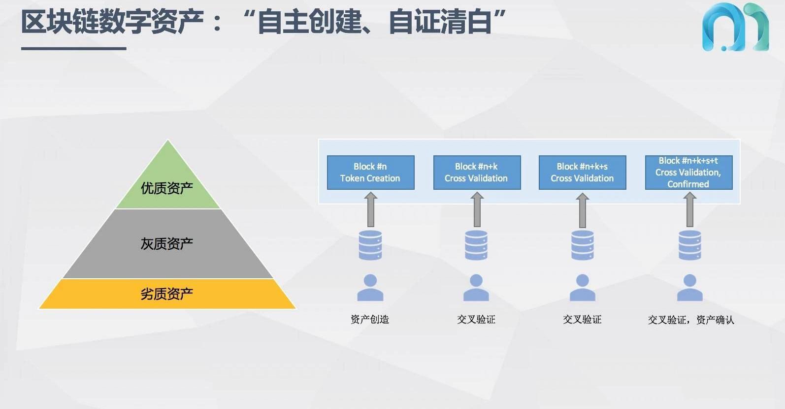 當數字資產被創建出來后,下一步就是流轉。流轉也是一個多方協作、相互驗證的過程,我這里不詳述了。我想請大家注意的是基于區塊鏈的這套賬本,在傳統金融機構審批過程中仍面臨成本較高的問題,因為現實世界中還有太多信息沒有上鏈,需要中心化的金融機構進行大量的人工調研和審核,反而降低了效率。