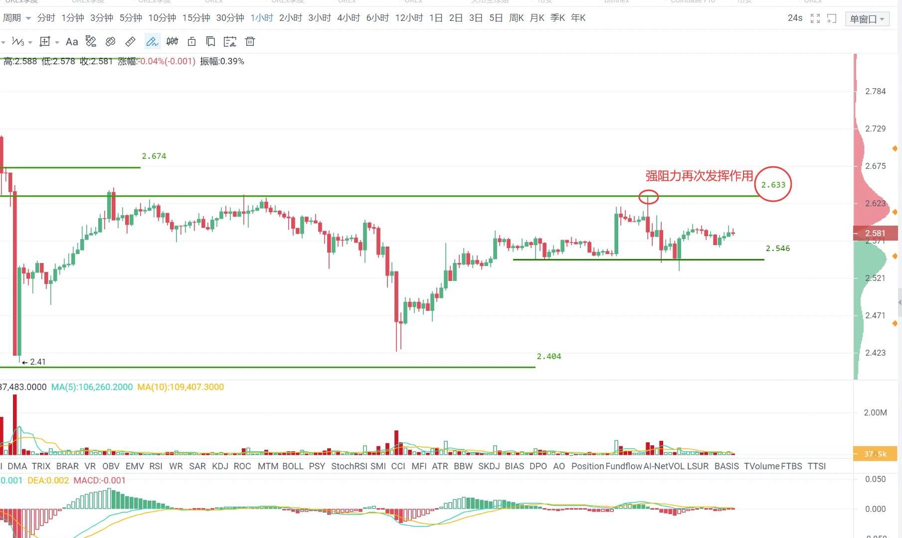 各級別性質:日線-下跌,4小時-盤整,1小時-下跌截圖來自OKEXEOS季度1小時圖:目前的客觀走勢及應對策略:昨天晚評的提醒應該說是很及時的,昨天那些補漲的主流幣都悉數回吐了補漲那部分漲幅,有些還創出了新低。這種類型的走勢歷史多次發生,正所謂“以史為鏡,可以知興替”,多復盤,做足功課,少挨刀。接下來繼續把關注中心放在2.63一線阻力即可,不過該阻力就是明確的人弱勢格局,就不能對上漲太樂觀,短線以靠近阻力位的滯漲信號做空為主,當然也不用太悲觀,大的框架還是震蕩,已經進行了近三個月的震蕩格局不容易很快改變,所做空最好只做阻力位附近的空單,盡量不去在大陰線出來后去追空。主觀預期:昨日預期基本兌現。接下來依然如此認為,2.63不會有效上破,繼續弱勢運行,今日依舊有望再去測試2.4-2.5支撐區。本段不作為交易參考。阻力與支撐阻力:2.63--2.68--2.76支撐:2.54--2.48--2.40