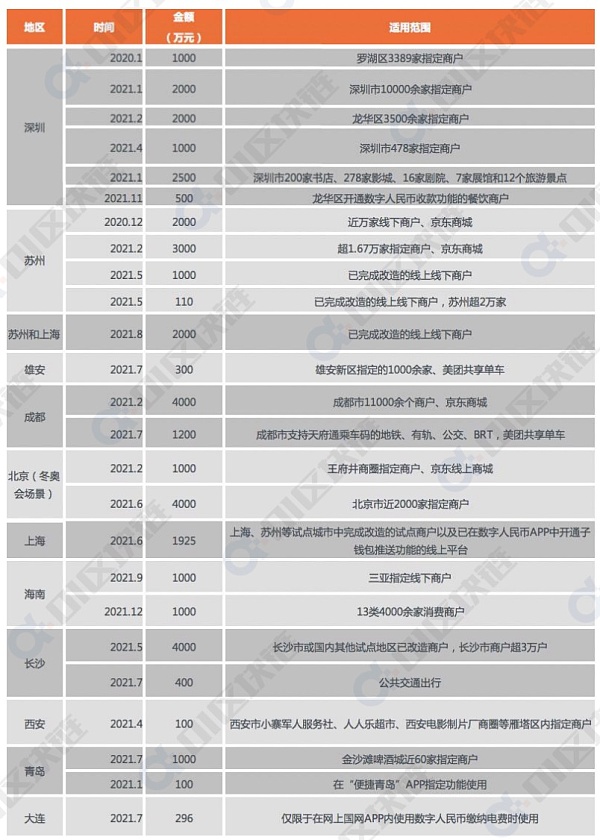 根據01區塊鏈不完全統計,截至目前,11地累計發放的數字人民幣紅包金額已超3.7億。數字人民紅包的適用范圍也從線下指定商戶逐步擴展到“線上+線下”完成系統改造的商戶,應用范圍穩步擴大。