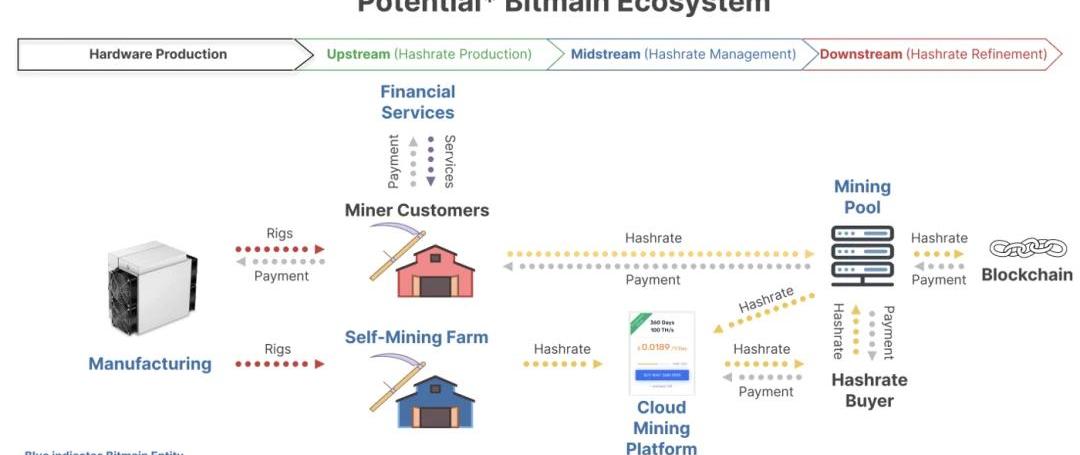 盡管人們對受歡迎的云挖礦公司有著各種不同的看法,但毫無疑問,這些公司在挖礦生態系統中發揮著重要的作用。GenesisMining是成立最早也是最大的云挖礦公司之一。他們提供SHA-256和其他一些算法的合同。這家公司的基地在歐洲,擁有自己的所有挖礦設備。這家公司就是一個很好的有關傳統合法的云挖礦公司的例子。Bitdeer是采礦領域中最有意思的公司之一。作為Bitmain的子公司,它處于許多挖礦產品的核心,這包括Bitmain,Antpool,BTC.com,Via.BTC,Matrixport等。同樣有趣的是它使我們得以重新構想算力在礦場,礦池,云挖礦平臺還有買家之間進行交易的方式。從理論上講,算力可以在實際用于網絡上之前經歷多次轉手。以下是一個可能在當今的潛在生態系統。
