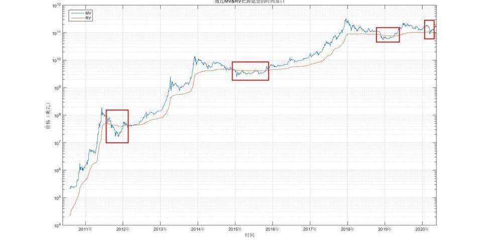 股票交易者通過公司的盈利能力判斷價格高低;原油期貨投資者判斷復雜的供需關系與地緣形勢;價值投資者堅信「內在價值」是投資品價格波動圍繞的中樞。由于比特幣并非經濟體和消耗品,投資者難以照搬熟悉的估值方法判斷其價格相對高低。WillyWoo與PlanB借鑒了傳統投資標的的估值方法和價格模型開發出NVT與S2F等指標與模型,我們放棄了這一思路,并嘗試在比特幣不同方面的數據中尋找簡單有效的指標,在不同數據中尋找的指標具有正交性。我們理想地認為,當他們同時指示買入時會有最大的勝率,我們將在未來不斷地回測這個假設。冪律走廊與冪律波動線單純地來自比特幣價格的歷史走勢數據,對價格走勢的分析理論在傳統的交易市場中已經充分成熟了,可以套用在任何交易品上。我們的工作是引入更多方面的數據,在其中尋找與價格走勢強相關的指標,當然,這些數據主要來自比特幣本身,即鏈上數據。托比特幣本身設計機制的福,我們可以方便地得到全賬本,上面記錄了比特幣從創世區塊以來每一筆交易的時間、數額、參與方等信息。將每枚比特幣以其最后一次轉賬時的比特幣價格累加起來可以輕松地獲得全部持幣者的成本之和,Coinmetrics將其定義為為RV,即比特幣已實現的市值。這個概念與MV,即一般意義上的市值相對應。MV與RV的相對水平指示了整個市場的浮盈情況。